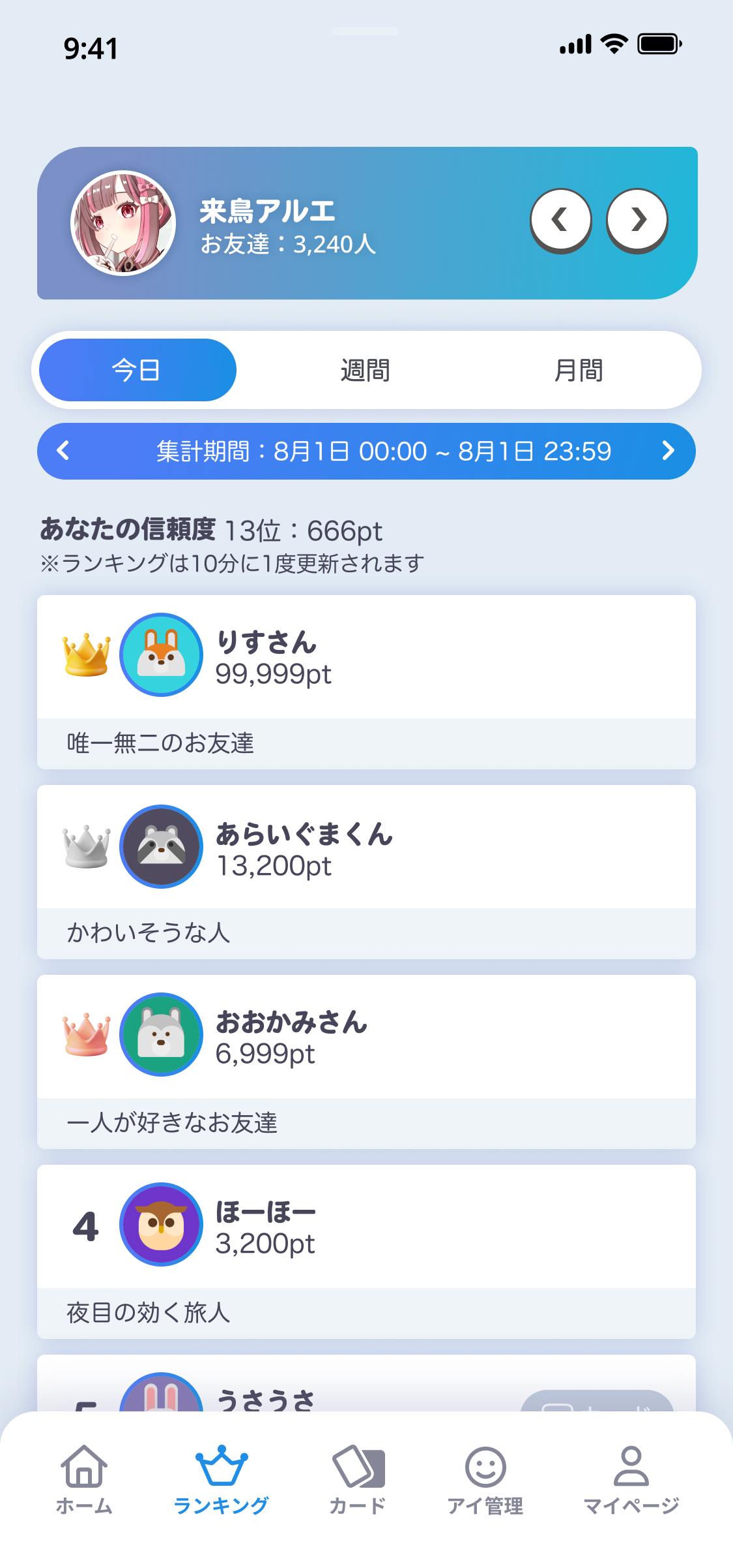獲得した信頼度を毎週(月~日)でアイ同士で競い合います。上位クリエイターは報酬(ルビー)を獲得できます。